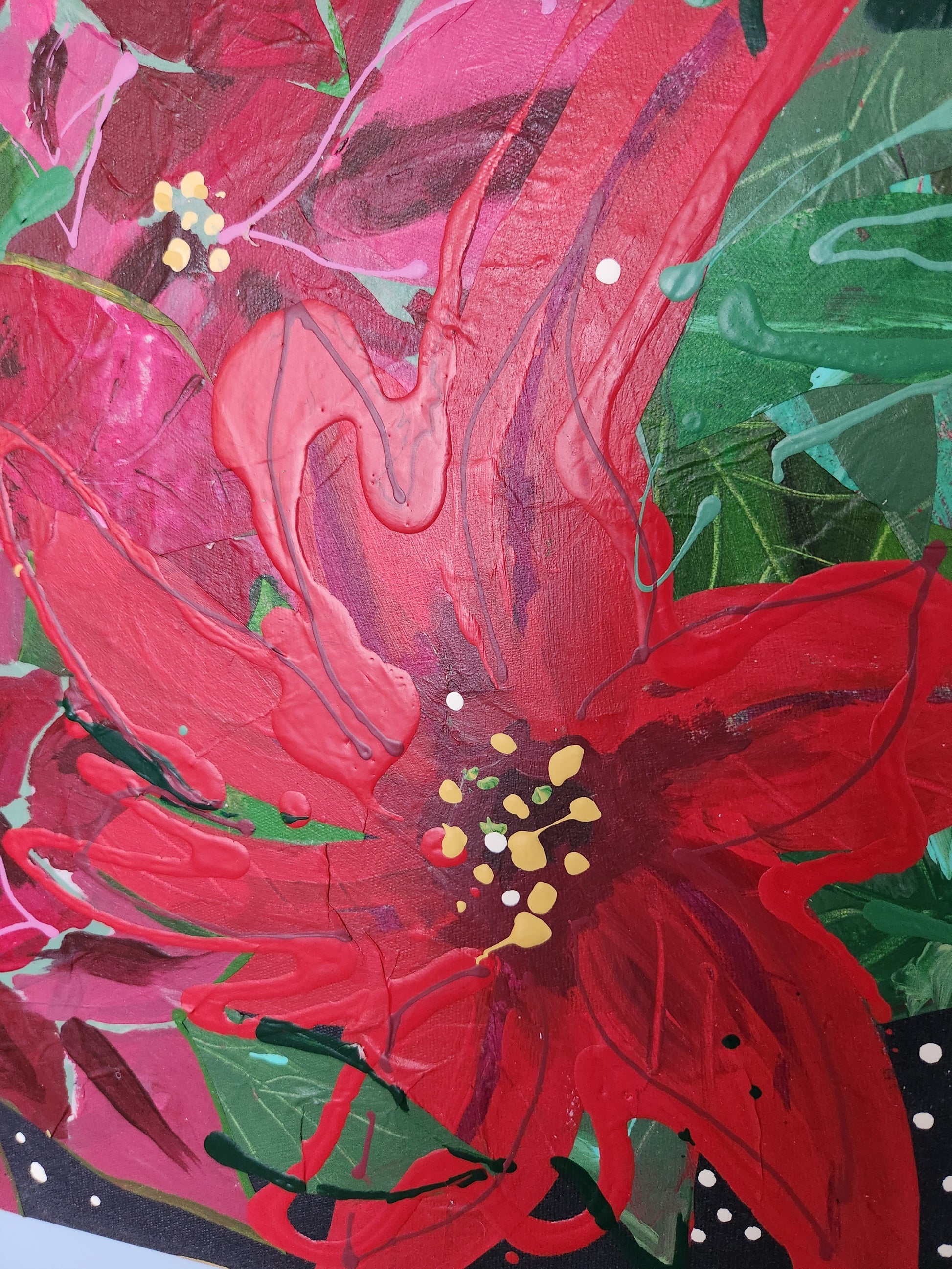 Of the series, this one has the most magenta in the shades of red. Red is still very dominant, it is not as pink as the actual Robyn Pink poinsettia. It's an interpretation, what can I say? This one has the most obvious of the dots and strung lights on the trees in the background. The white dots on the darker areas guide the eye around with the repeating pattern. The white dots also have a relationship with the yellow dots in the center of each. They yellow dots are actually the flower as they are the nectar producing parts.