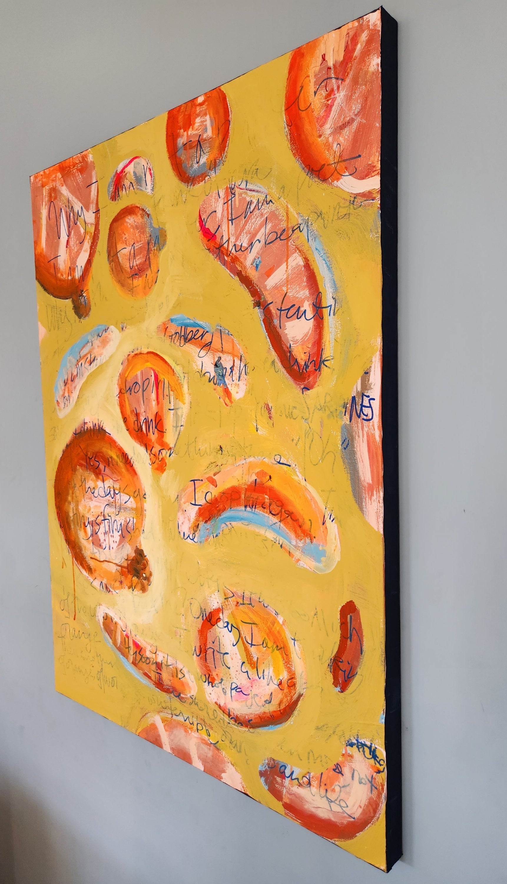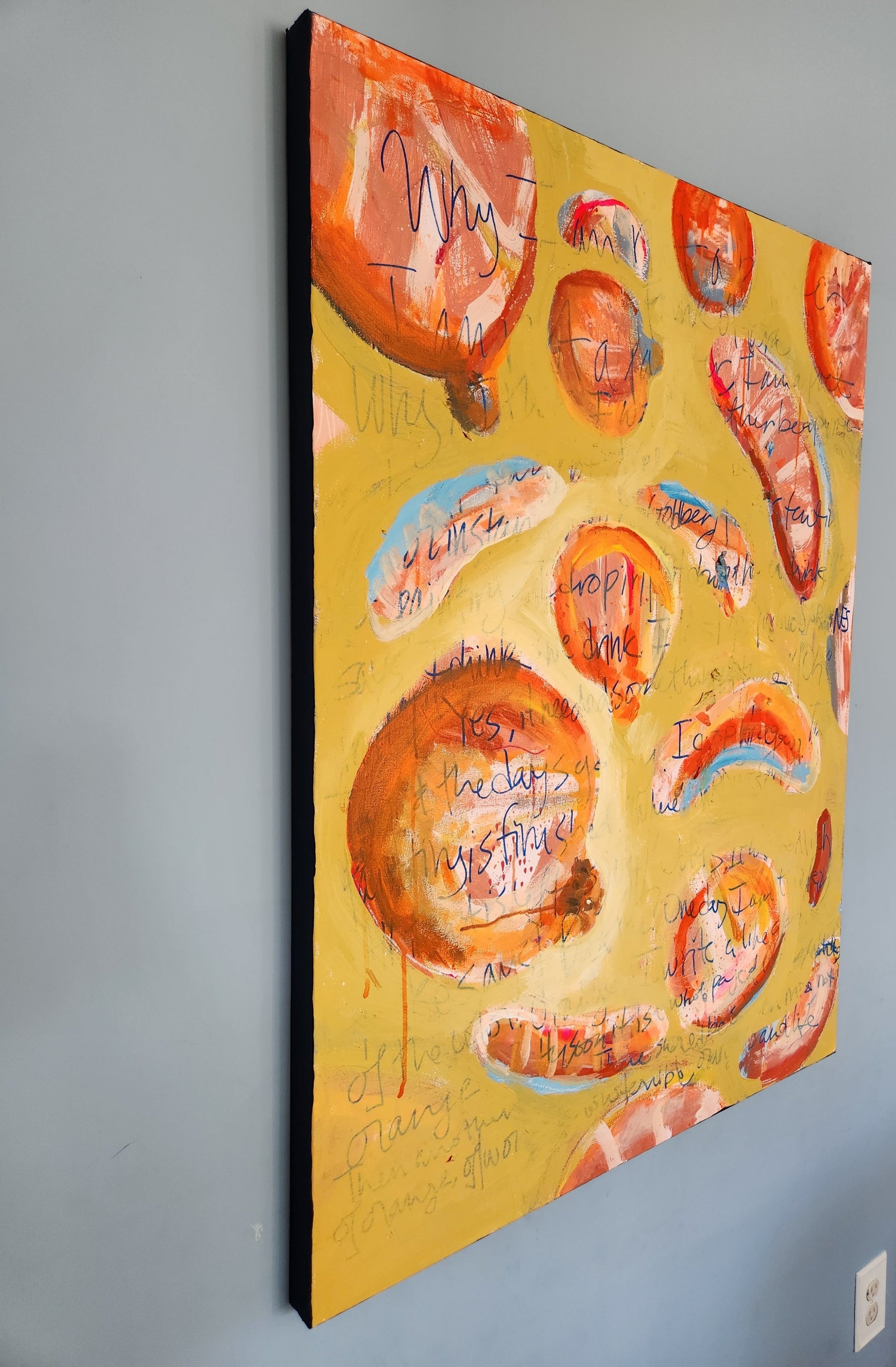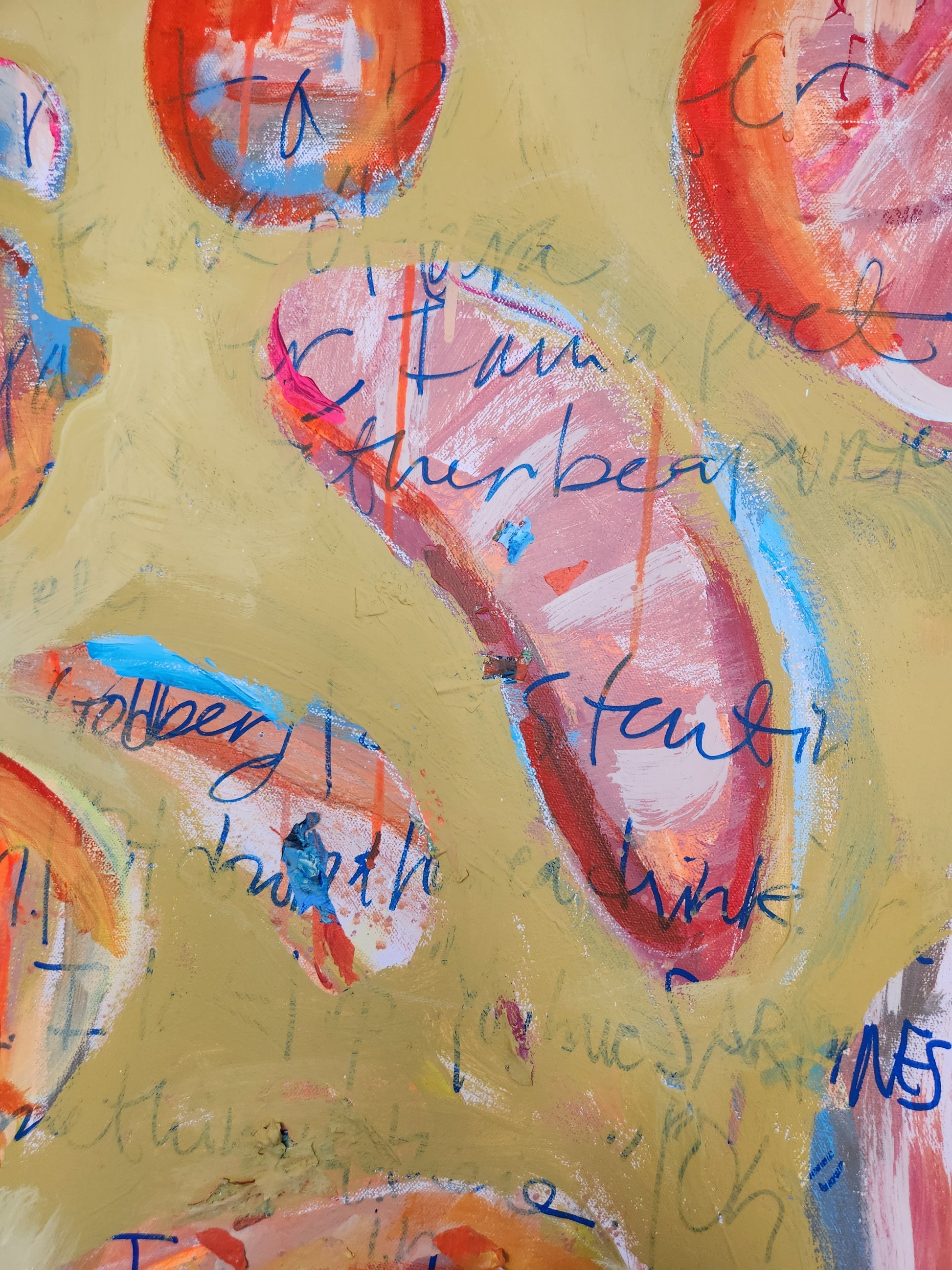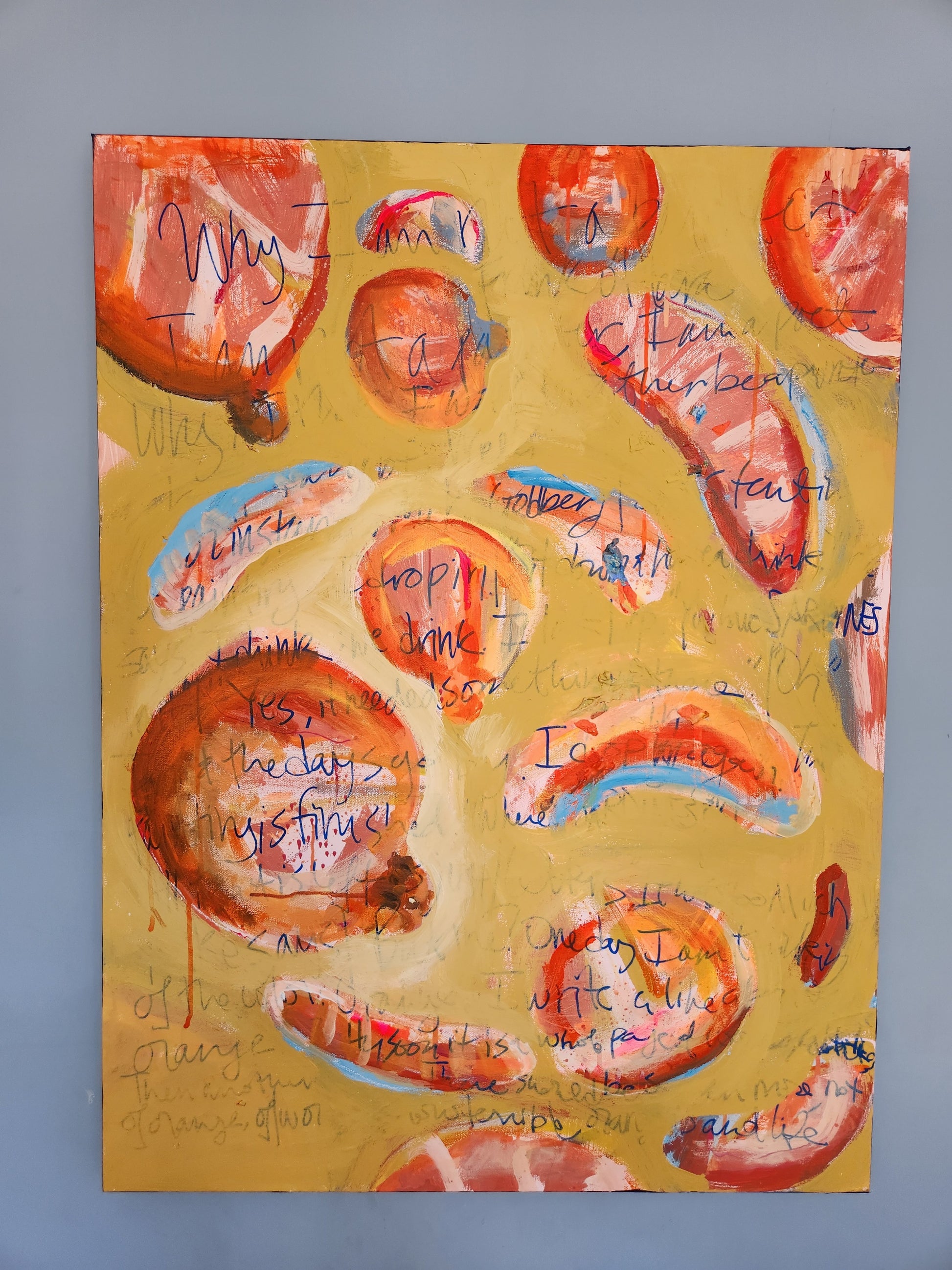 I got to take this painting to the Houston Visual Arts Alliance critique 2x, which is fun because it allows the group to see the evolution of the work. The first time I took it, they couldn't see where these paintings were going. It was one big cross section of an orange with all the segments showing. They gave me feedback on my rendering and the overall vibe. The paintings had the feeling of a messed up still life in a gravity-less world. I think they were confusing to look at.